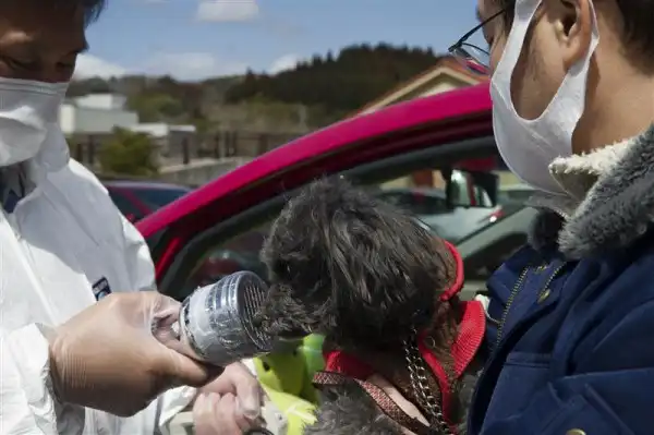Кавамата (Kawamata), Япония, 27 марта 2011 - Официальные представители правительства исследуют уровень радиации исследуют на собачьей шерсти. Город Кавамата находится в 60 км от АЭС "Фукусима-1".