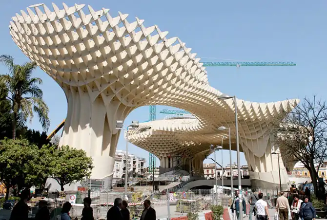 Сооружение под названием Metropol Parasol — творение немецкой компании J. Mayer H. Architects. Как уверяет Inhabitat, эта система из множества деревянных панелей — самое крупное на планете строение из древесины. Длина мегаструктуры составляет около 150 метров, ширина — 75, а высота — 28 м.