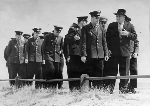 Ю.А. Гагарин среди сотрудников космодрома Байконур. Фото РКК "Энергия"