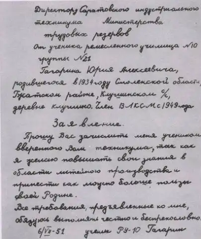 Заявление ученика ремесленного училища Юрия Алексеевича Гагарина