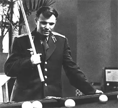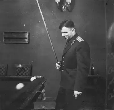 Первый космонавт Планеты Юрий Гагарин играет на бильярде с Космонавтом-2 Германом Титовым