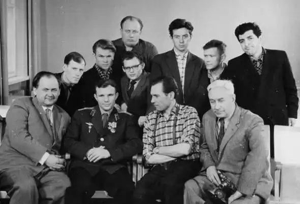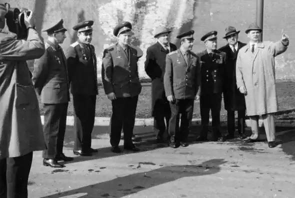 Ю.А. Гагарин с отцом среди киногруппы фильма "Первый рейс к звездам". Фото Е.И. Рябчикова