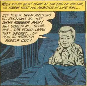Ральф Дибни был обычным парнем, который открыл секретную формулу, сделавшую его тело сверхэластичным. Т.е. да, это неприкрытый плагиат Пластичного Человека. Неприкрытый настолько, что даже сам автор признался, что создал этого персонажа только потому, что не знал, что DC Comics уже выкупил права на Пластичного Человека за несколько лет до того, так что не было никакого смысла создавать его копию.