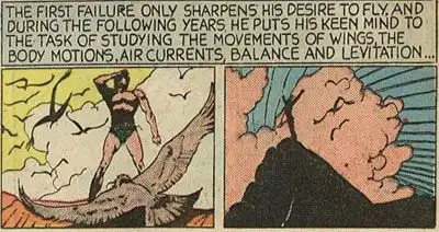 К слову, я не сказал, что кондоры еще и научили его летать? Да, видимо, птичье воспитание уже само по себе подразумевает плевок в лицо аэродинамике. Хотя все можно понять – будь вы в те годы автором комиксов, работающим за гроши, вам бы вся эта аэродинамика была до одного места.