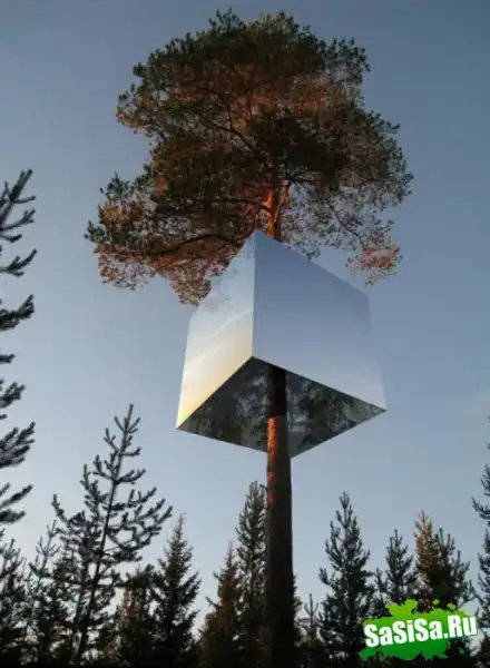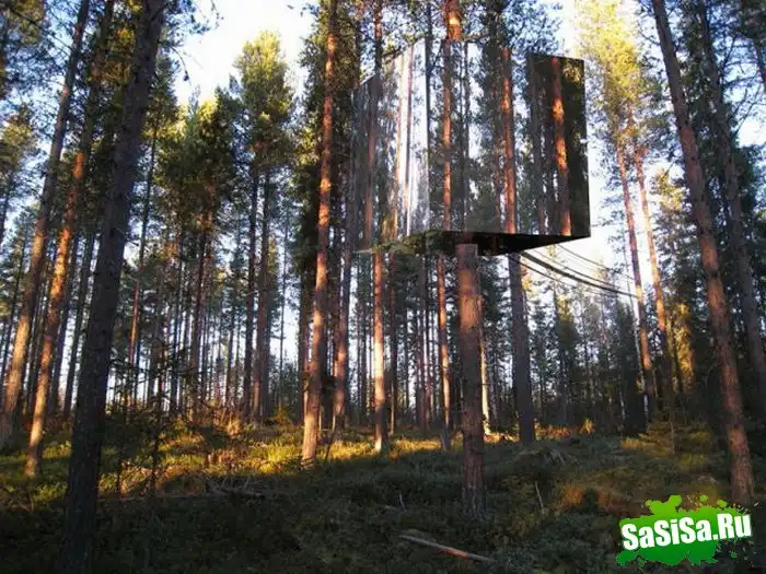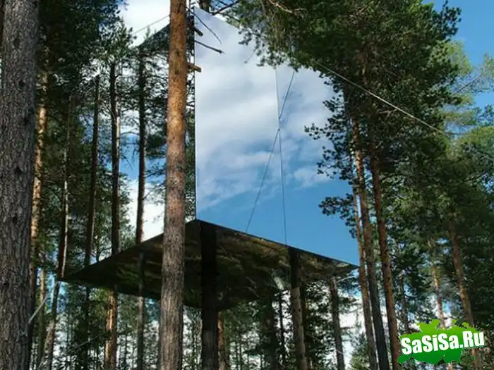 Помимо того что он зеркальный, так он еще и подвешенный на деревьях. Этот необычный отель находится в Швеции. В нём есть терраса на крыше, гостиная, ванная, небольшая кухня и большая кровать.