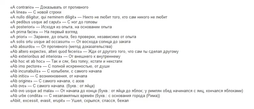 «Ab ovo usque ad mala» — От начала до конца (букв.: от яйца до яблок; у римлян обед начинался с яиц, кончался яблоками)