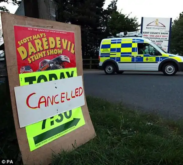 Во время рекламного шоу "Полет человека-ядра из пушки", устроенного в день празднования Пасхи, десятки британских семей увидели смерть каскадера Скотта Мея - он пролетел мимо страховочной сетки и разбился о землю.
