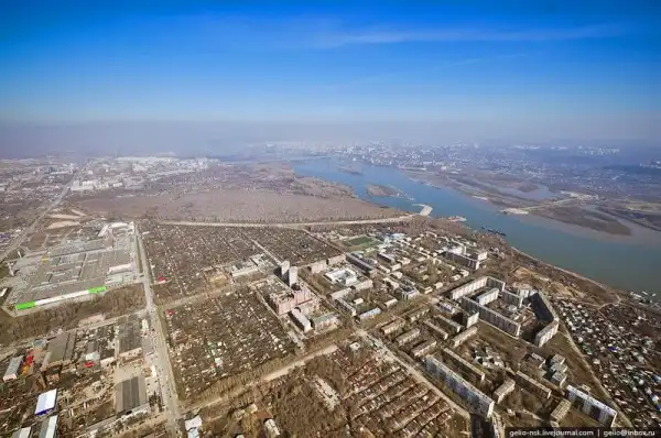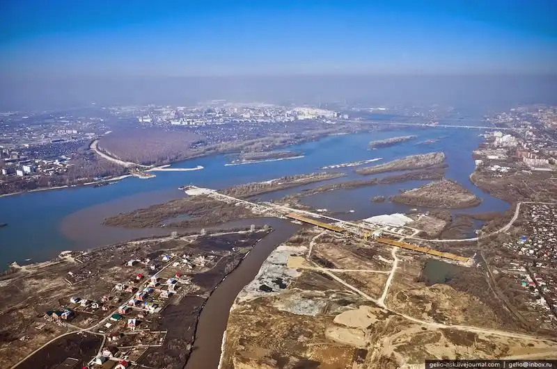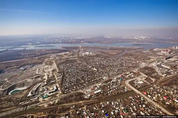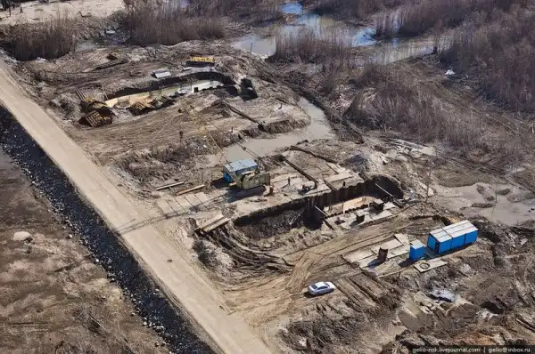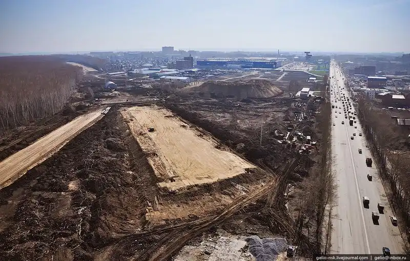 Улица Большевистская Видна временная дорога под сооружение моста.