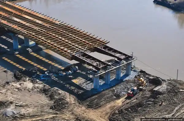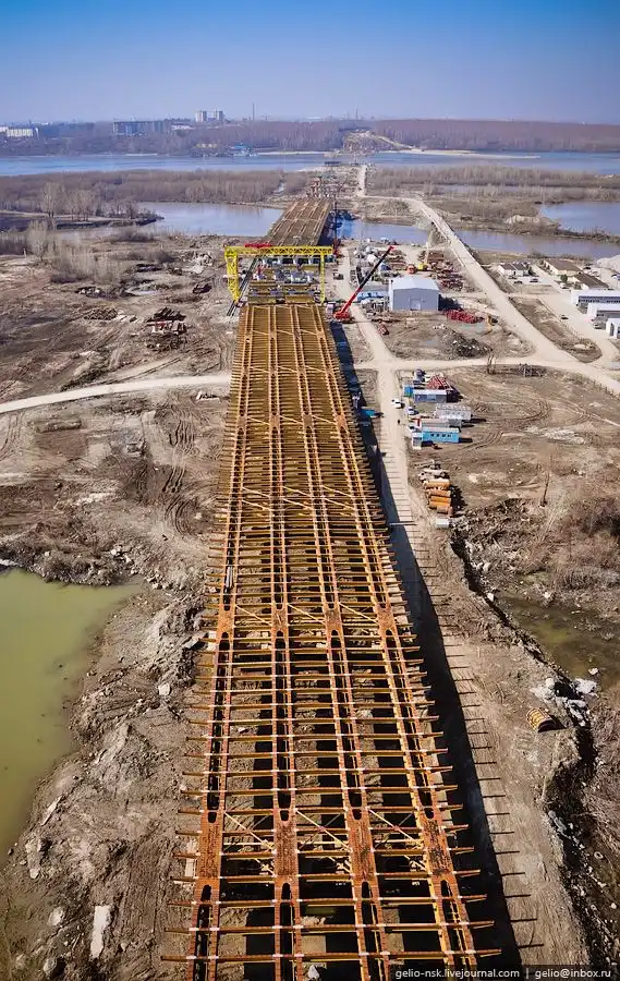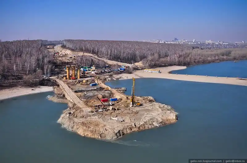 Надвижка пролётного строения 6-10. Сооружение опор с 10 по 11 Вид со стороны острова на р. Иня