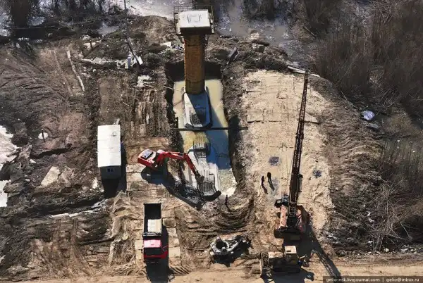 Стройплощадка левого берега На опоре №4 забит весь шпунт. На опоре №5 заканчивают БНС (буронабивные сваи)