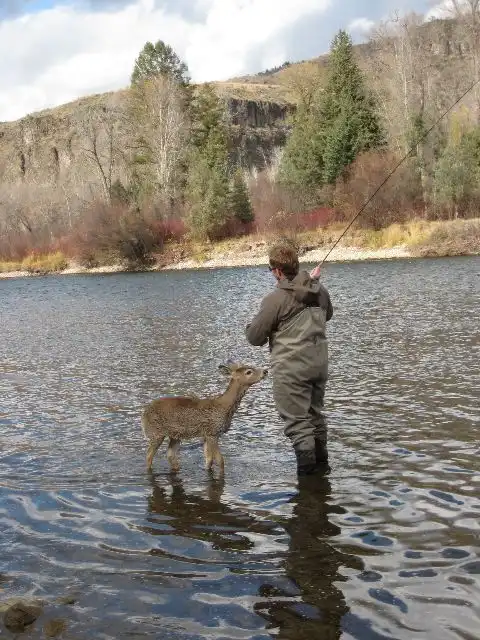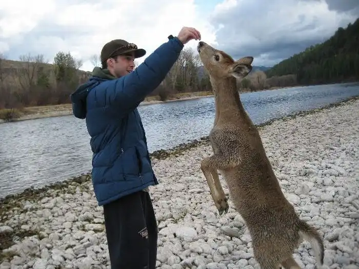Маленький олененок вышел из леса к туристам, которые ловили рыбу.
