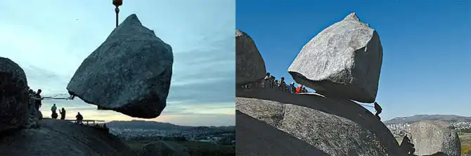 Это — огромный валун, весом более 300 тонн, повисший на самом краю скалы, мерно покачивающийся от порывов ветра, и вот уже несколько тысячелетий словно прикован неземной силой, кажущейся невозможной для человеческого понимания. Забредшие сюда туристы, утром, как только посыпались, с неверием тут же выбегали на улицу, что бы проверить на месте ли валун?