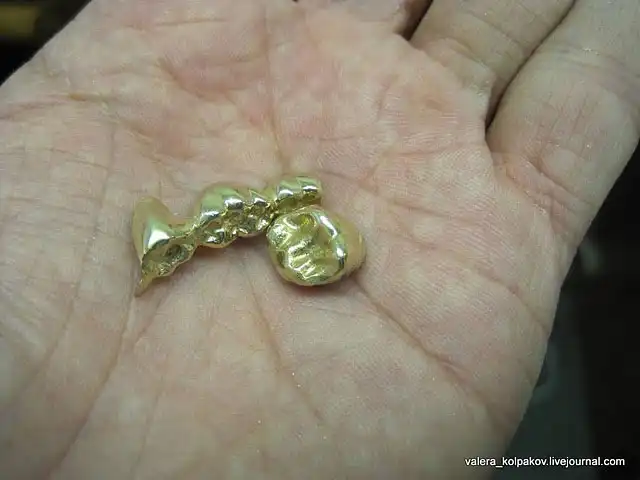 Золотая коронка из моего собственного рта и мост друга. Вычистил остатки зубов, можно продать на аукционе *бей, золото сейчас дорого стоит.