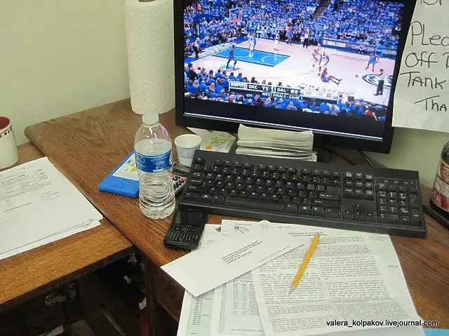 Поздним вечером смотрю баскетбол, занимаюсь бумажной работой.