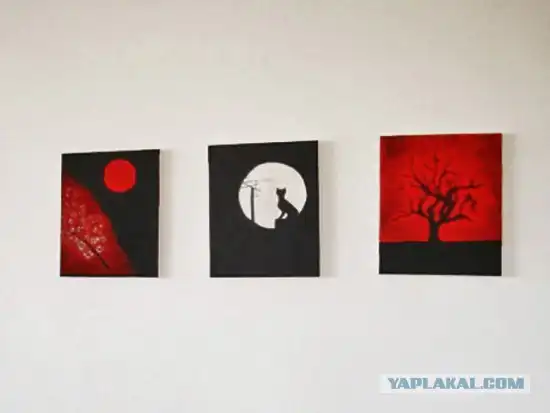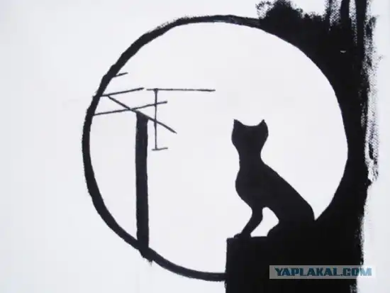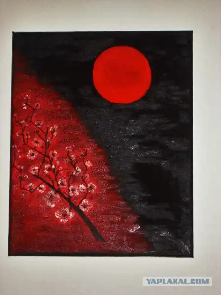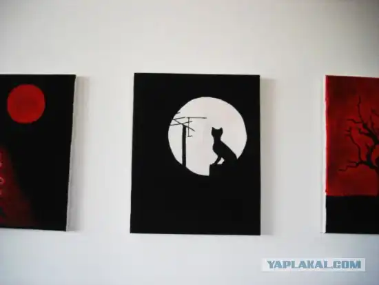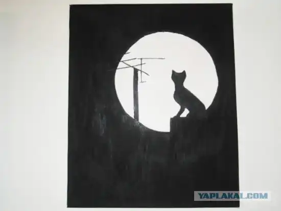 далее - белым на черном я дорисовала антенну (на фото плохо видно, так как отсвечивает) и пришла к выводу что моя луна смотрится дыркой в картине из которой выглядывает ненавистная белая стена. Поэтому я добавила немного красного, совсем чуть-чуть, а еще я решила, что кошка получилась очень худой - и добавила немного живота))