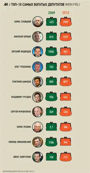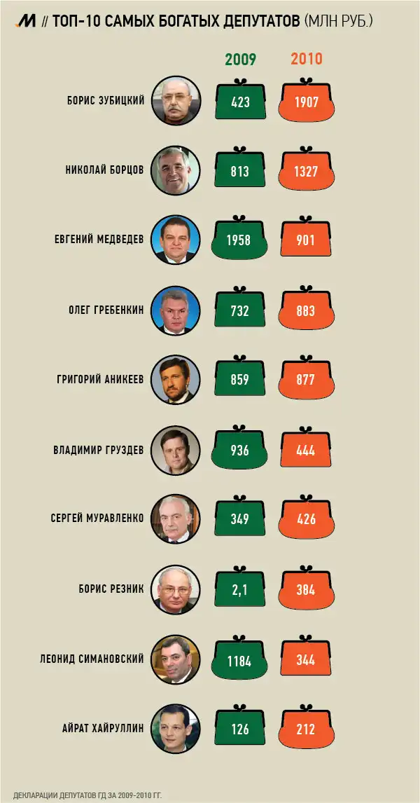 Больше всех в Госдуме в 2010 г. заработал член фракции «Единая Россия» Борис Зубицкий.. Его задекларированный доход составил 1,9 млрд руб. На втором и третьем местах оказались также единороссы: бывший акционер ГК «Лебедянский» Николай Борцов с доходом 1,3 млрд руб. и Евгений Медведев, заработавший 901 млн руб. Причем у последнего в 2009 г. доход был в 460 раз меньше. В общей сложности 450 депутатов и их семьи заработали в прошлом году 14,3 млрд руб.