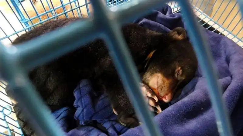 Когда власти вскрыли багаж араба, набитый живым грузом, большинство находящихся там животных были вялыми и много зевали, вероятно от того, что накануне им дали снотворное или же от недостатка кислорода. Все зверьки находились в крошечных клетках-футлярах, в которых едва ли могли пошевелиться. Сразу же после конфискации всем изъятым животным сразу же была оказана медицинская помощь. На фото - 3-месячный детеныш белощекого гиббона.