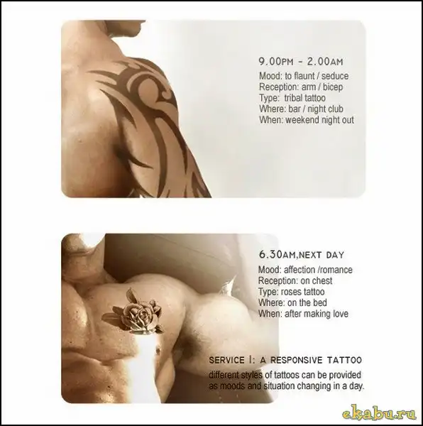Правда, рассчитан этот концепт, судя по визуализациям, на 2020-е годы. И суть идеи заключается в том, чтобы предварительно подготовить кожу кандидата к вмешательствам, вживив в нее некую матрицу из электронных чернил. Стало быть, если кандидат желает украшать рисунками руку, ногу, грудь и ягодицы, матрицу вживляют именно туда. Раз - и насовсем.