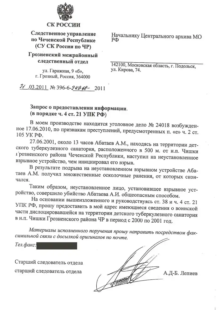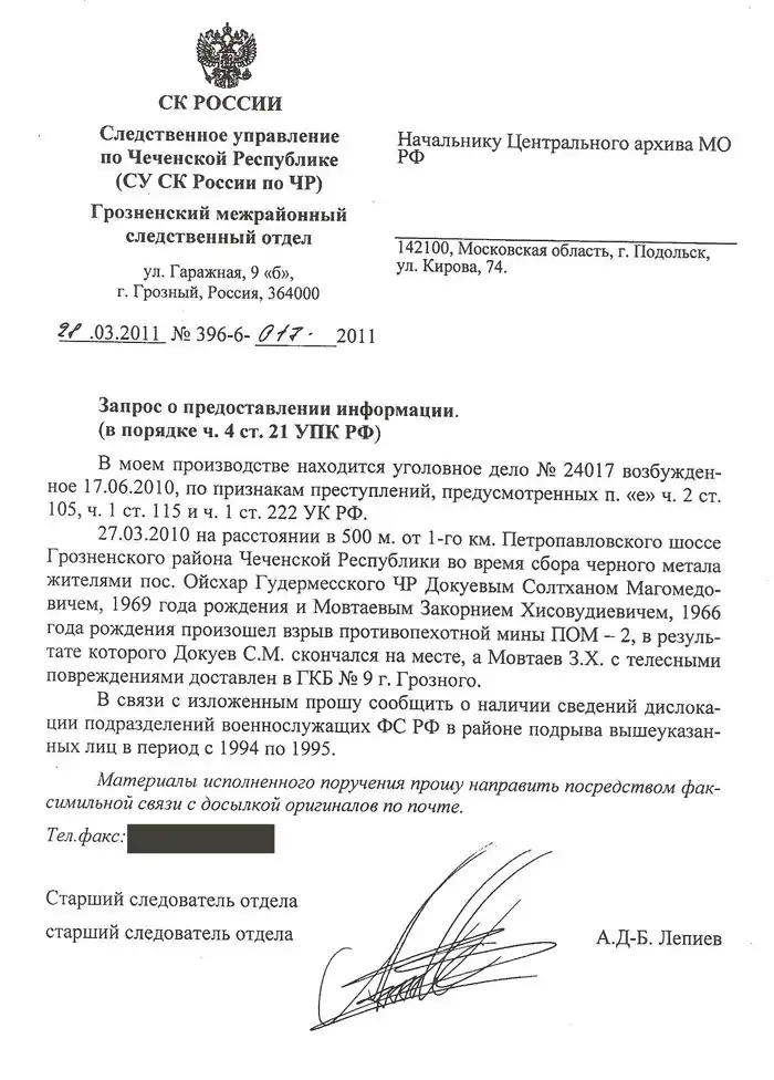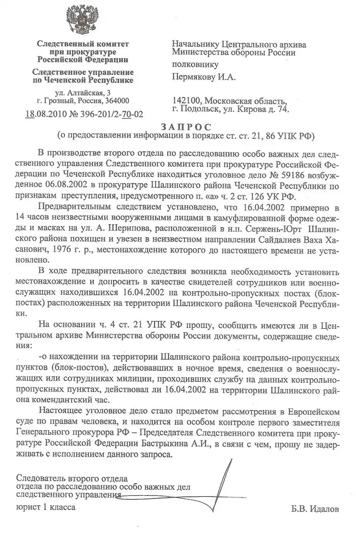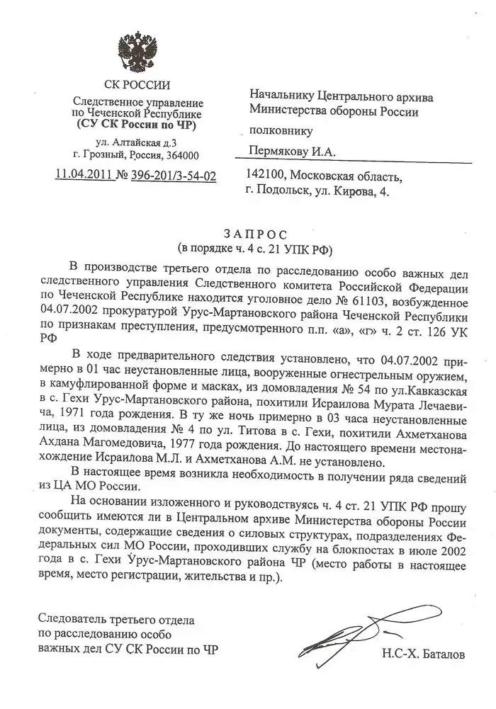 Так, например, следователь третьего отдела по расследованию особо важных дел из Грозного некто Н. С-Х.Баталов (см. фото) просил сообщить сведения о военнослужащих, проходивших службу на блок-постах в селе Гехи Урус-Мартановского района в июле 2002 года. И в скобках уточнял, какого характера сведения ему нужны: «место работы в настоящее время, место регистрации, жительства и пр.»