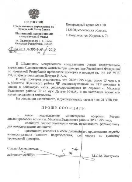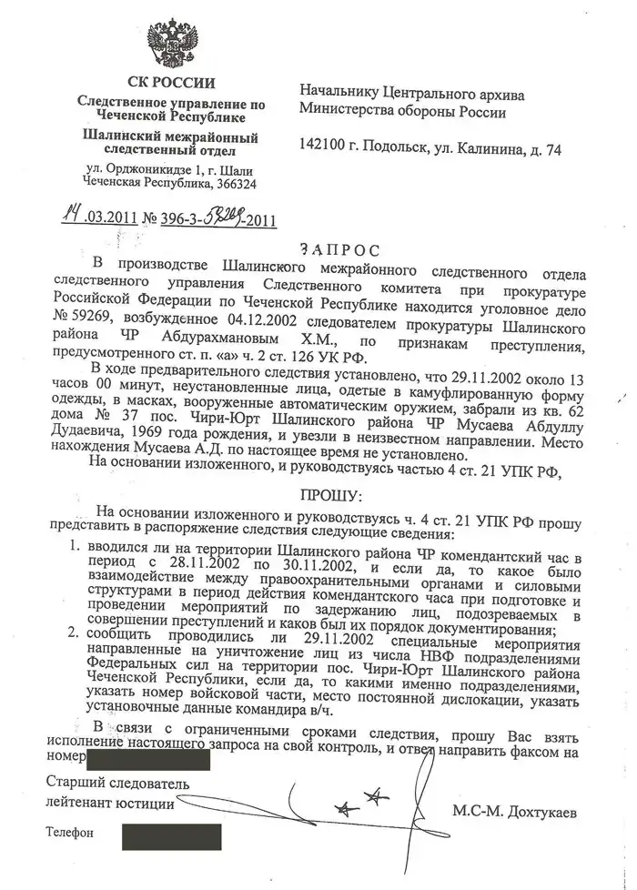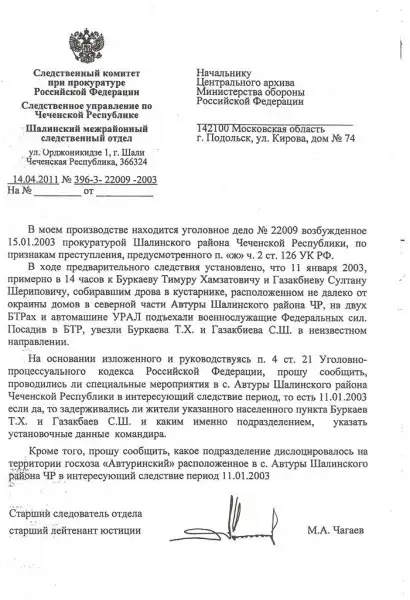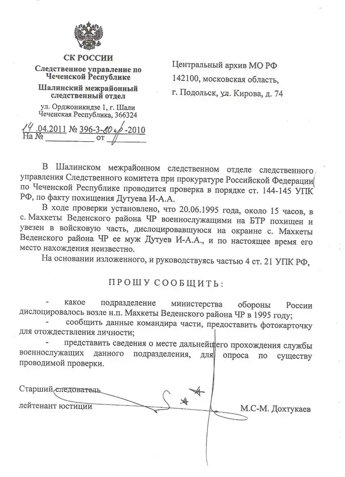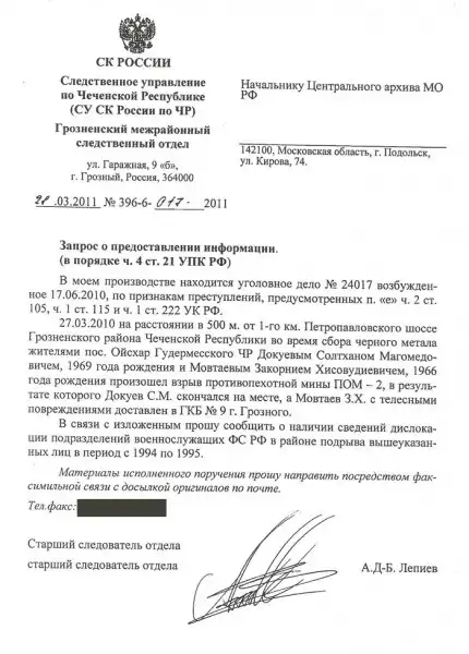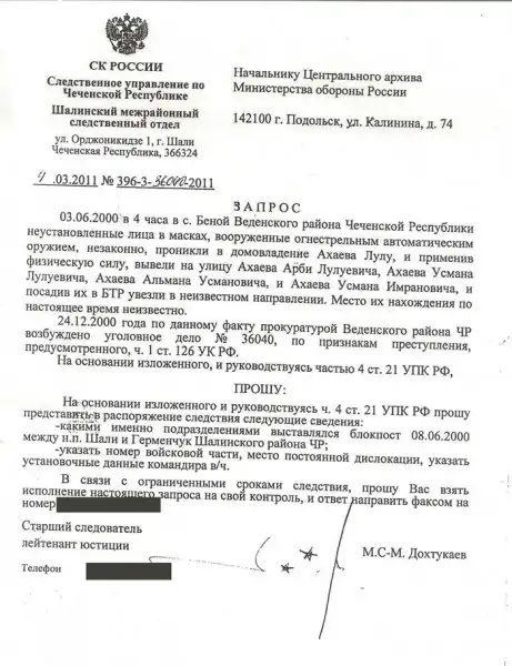 - Ну, я не могу однозначно утверждать. Но когда следователь лейтенант юстиции М.Дохтукаев из Шалинского следственного управления (см. фото) просит сообщить «номер войсковой части, место постоянной дислокации и установочные данные командира, который участвовал в специальных мероприятиях по уничтожению НВФ (незаконных вооруженных формирований - ред.) на территории Шалинского района», поневоле напрашивается вопрос: «А зачем ему домашний адрес командира? Зачем следователю фотокарточка командира, которую он просит в другом запросе?»