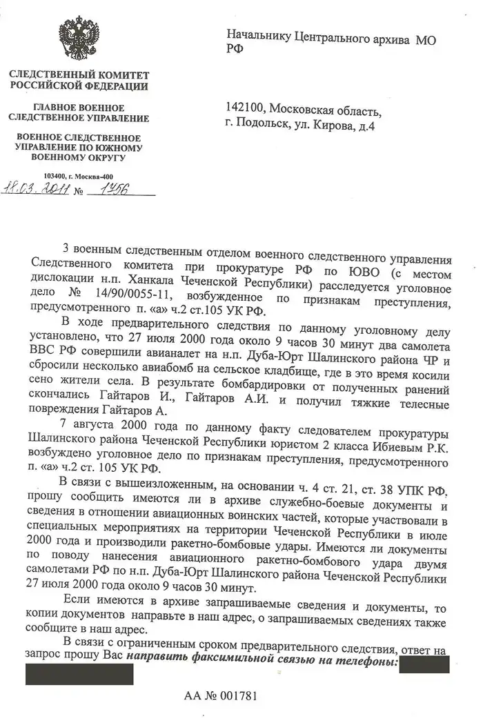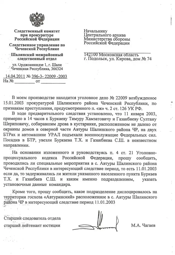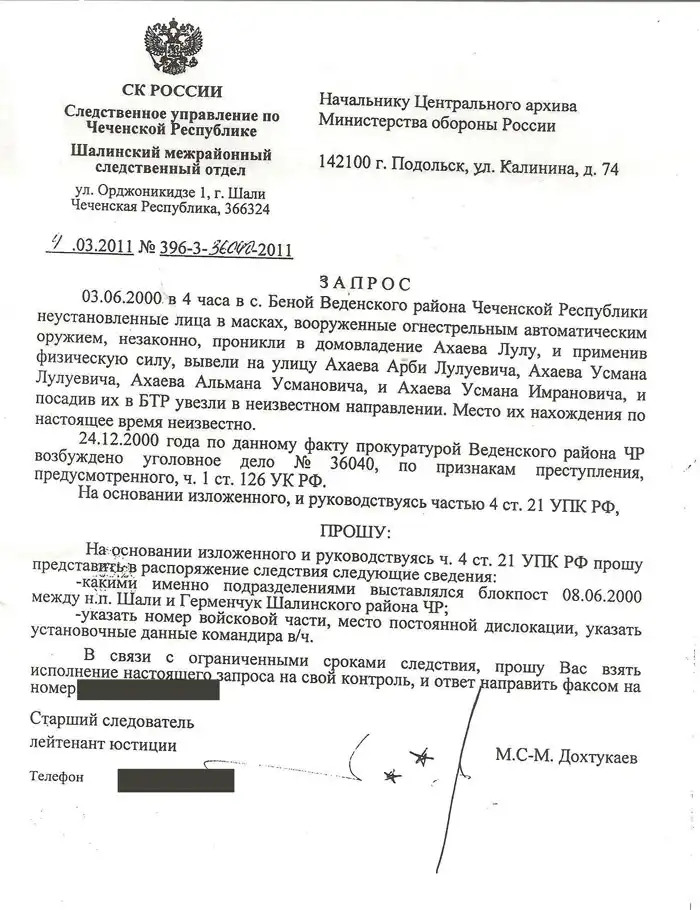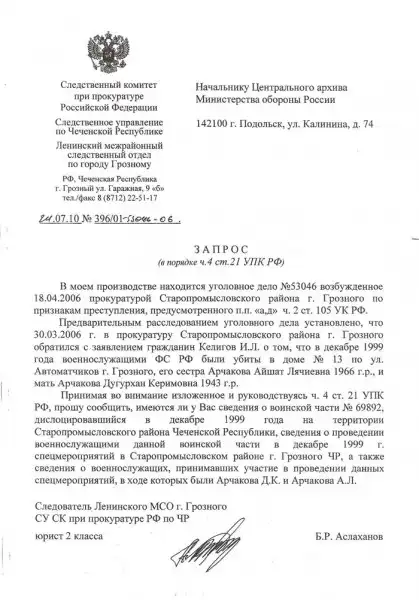- В этой папке немного, сюда отобраны только те, которые могут иметь отношение к военному ведомству. А вообще чеченскими следователями за последние несколько лет в разные силовые структуры отправлено около тысячи подобных запросов. И в МВД, и в ФСБ, и в ФСО, и в Минюст, и в Главную военную прокуратуру, и т.д.