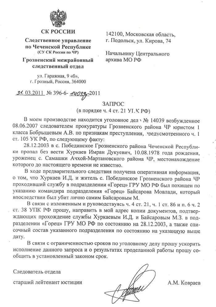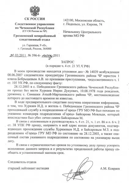 - Да, его расстреляли на Ленинском проспекте. В Байсарова выпустили 11 пуль. Он даже не успел вытащить пистолет. А всем было сказано, что тот оказал сопротивление при задержании. Он был личным врагом Рамзана Кадырова, который разогнал его отряд «Горец». Байсаров говорил, что на него идет охота и к нему даже была приставлена охрана из ФСБ. Которую накануне расстрела на Ленинском проспекте было приказано снять. Аналогично расправились с Ямадаевым – тоже днем и тоже в центре Москвы. Этот ряд можно продолжать, но вернемся к запросу. Следователь Ковраев (см. фото) просит прислать ему списочный состав байсаровского подразделения «Горец». Интересно, зачем он ему понадобился? Для каких следственных действий?