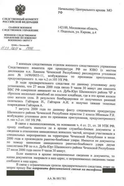 - Да, и при этом просит сообщить сведения о солдатах, которые несли службу на блок-постах. Это из разряда «в огороде бузина, а в Киеве дядька». Как-будто Баталов не знает, что солдаты с блок-постов уходить не имеют права. И маски не носят. А по селу ночью шастают те же самые боевики – с таким же оружием и в такой же камуфлированной форме. И людей похищают, которых потом найти никто не может. Нет, у него вполне конкретная просьба – дайте сведения о тех, кто служил на блок-постах. Или вот запрос по поводу гибели жителей Дуба-Юрта Гайтаровых. Как следует из документа, они погибли на сельском кладбище в результате налета двух самолетов ВВС России. Автор запроса требует сообщить, какие авиационные части наносили 27 июля 2000 года ракетно-бомбовые удары по территории Чечни. Зачем? Что одиннадцать лет в ходе боевых дейсвтий гибли и мирные люди, это, конечно, трагедия. Но почему этим розыском заинтересовались только сейчас?