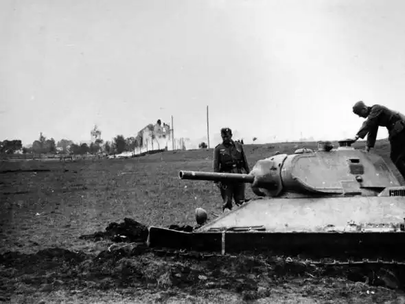Немецкие солдаты осматривают увязший в поле и брошенный танк Т-34-76 образца 1940 г.