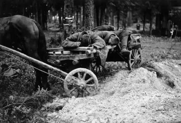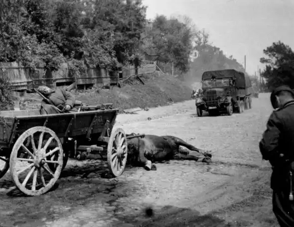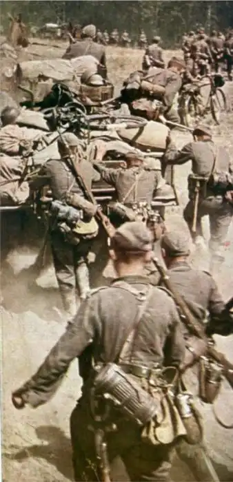 Немецкие колонны проходят мимо подводы с красноармейцем, ранее попавшей под огонь.