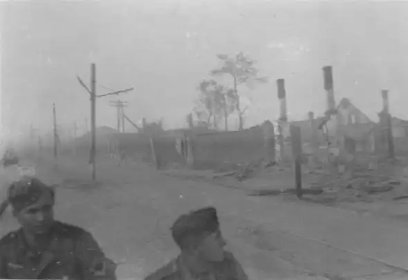 Солдаты вермахта наблюдают за горящей деревней. Территория СССР, дата снимка — ориентировочно лето 1941 года.