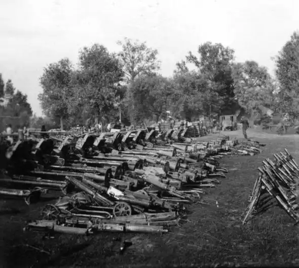 Немецкий сборный пункт советской трофейной техники и оружия. Слева советские 45-мм противотанковые пушки, затем большое количество станковых пулеметов «Максим» и ручных пулеметов ДП-27, справа — 82-мм минометы. Лето 1941 года.