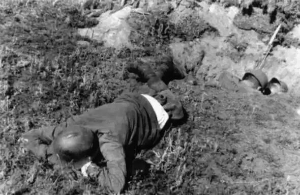 Погибшие советские солдаты у захваченных окопов. Вероятно, это самое начало войны, лето 1941 года: на бойце на переднем плане каска СШ-36 довоенного образца, позднее такие каски в Красной Армии встречались крайне редко и в основном на Дальнем Востоке. Также видно, что с него снят ремень — видимо, дело рук немецких солдат, захвативших эти позиции.