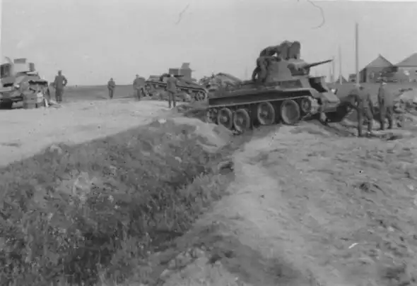 Немецкие солдаты на захваченных советских позициях. На переднем плане видна советская 45-мм пушка, дальше — советский танк Т-34 образца 1940 года.