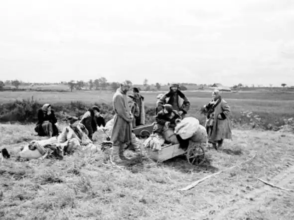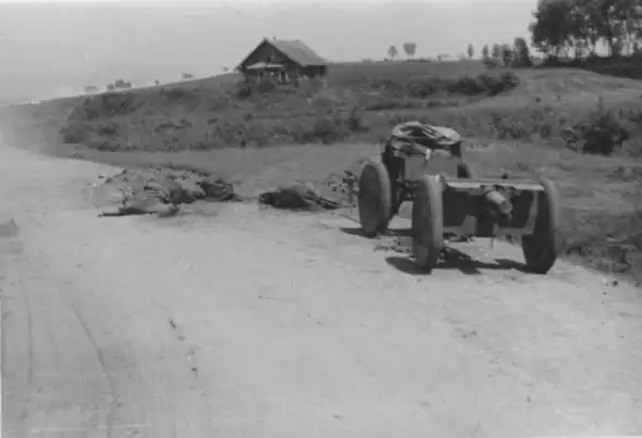 Погибшие советские солдаты, а также мирные жители — женщины и дети. Тела свалены в придорожный кювет, словно бытовой мусор; мимо по дороге спокойно движутся плотные колонны немецких войск.
