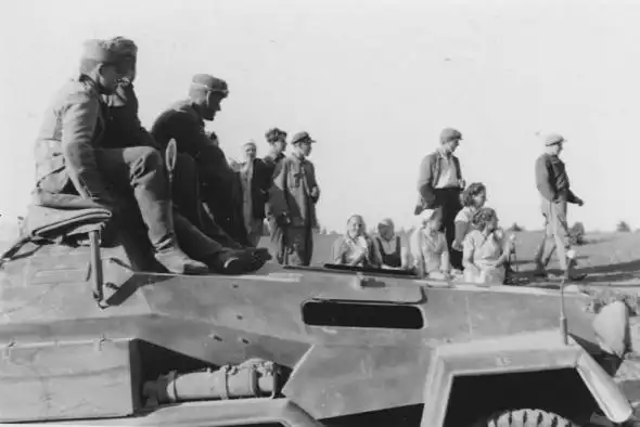 Немецкий бронетранспортер, немецкие солдаты на нем и местные жители в Белоруссии.