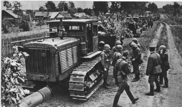 Перекур экипажей тракторных тягачей «Сталинец». Фото датировано летом 41-го
