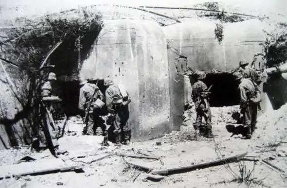 Солдаты СС у разрушенного ДОТа на «линии Сталина». Оборонительные сооружения, расположенные на «старой» (по состоянию на 1939 год) границе СССР, были законсервированы, однако после вторжения немецких войск некоторые укрепрайоны использовались Красной Армией для обороны.