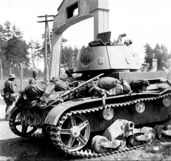 Погибшие советские танкисты и бойцы танкового десанта у ворот пограничной заставы. Танк – Т-26.
