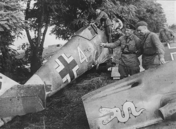 Бойцы Красной Армии осматривают подбитый зенитным огнем и совершивший аварийную посадку немецкий истребитель Bf.109F2 (из эскадрильи 3/JG3). Западнее Киева, июль 1941 г.
