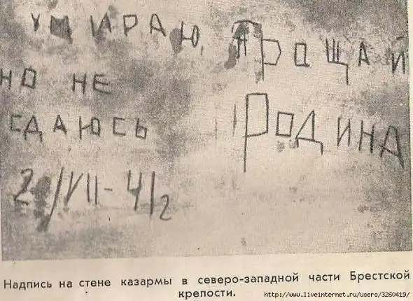 «Брестская крепость. Оборону два месяца держали пограничники и 132-й отдельный батальон конвойных войск НКВД СССР. Город Брест был поспешно оставлен частями Красной Армии в 8.00 утра 22.06.1941 после боя с пехотой противника, переправившейся на лодках через реку Буг. В советское время все помнили надпись одного из защитников Брестской крепости: «Умираю, но не сдаюсь! Прощай Родина! 20.VII.41г.», но мало кто знал, что она была сделана на стене казармы 132-го отдельного батальона конвойных войск НКВД СССР.»