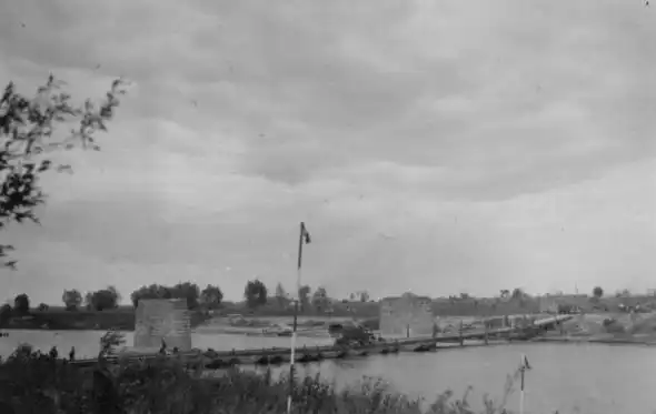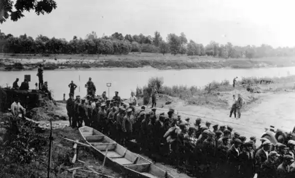 Колонна советских пленных переправилась через реку Сан по саперному мосту. Среди пленных заметны есть не только военные, но и люди в гражданской одежде: немцы задерживали и брали в плен всех мужчин призывного возраста, чтобы они не могли быть привлечены в армию противника. Район города Ярослав, июнь 1941 года.