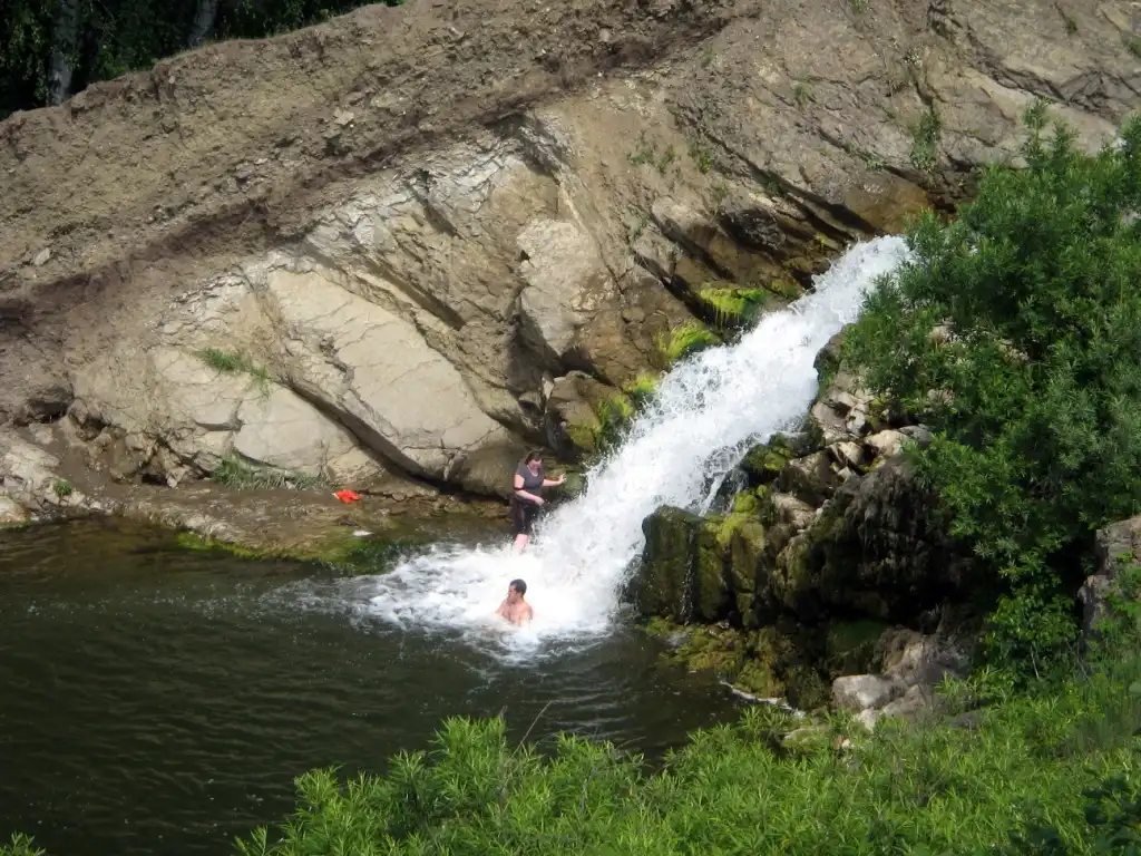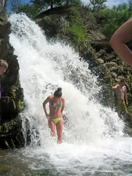 Теперь уже никто не помнит, или просто не желает рассказывать, каким образом удалось так перенаправить реку Выдриху, что получился очень большой и чистый водоем. Благодаря подпитке этого озера от нескольких мелких речушек, уровень воды в нем постоянно растет, а ее избытки переливаются через большой навал камней, образуя почти пятиметровый водопад.