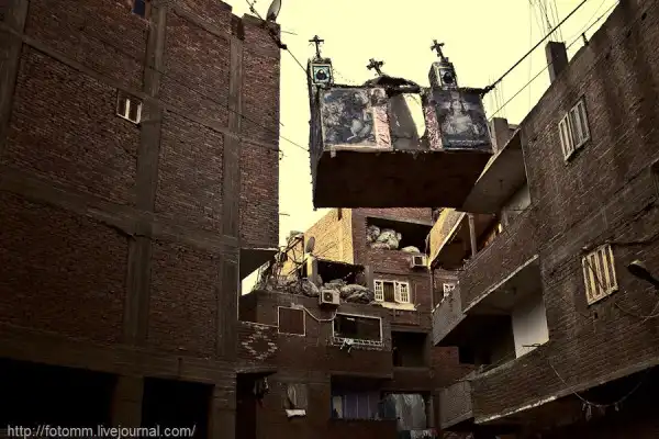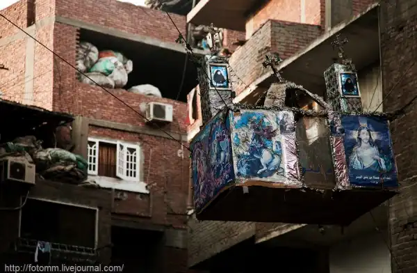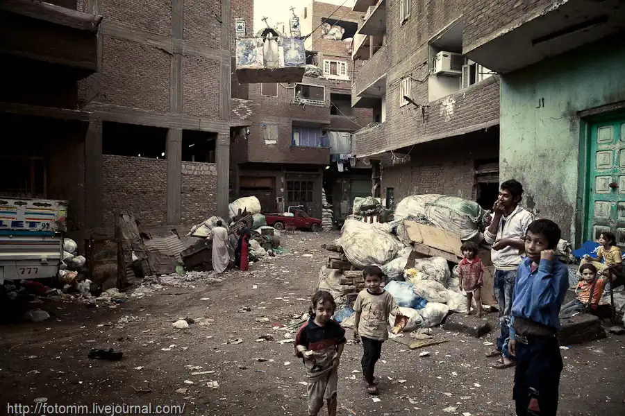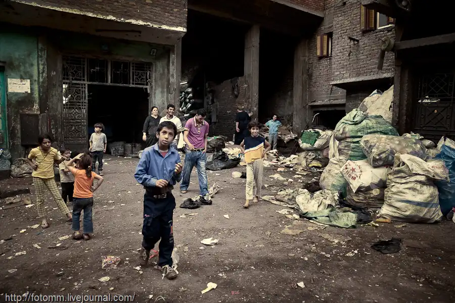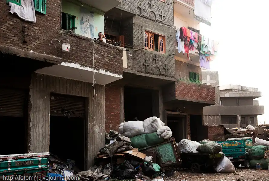 Основное население квартала – копты , сторонники одной из ветвей христианской церкви. Мусорщиками копты стали ещё во времена халифа Ал-Хакима. Это был правитель из династии Фатимидов, завоевавших Египет. Он положил конец относительно мирной жизни всех христиан и мусульман, живших в стране. Копты, в частности, лишились всего. Им было положено заниматься самой грязной и тяжёлой работой. Так мусор и стал их жизнью.