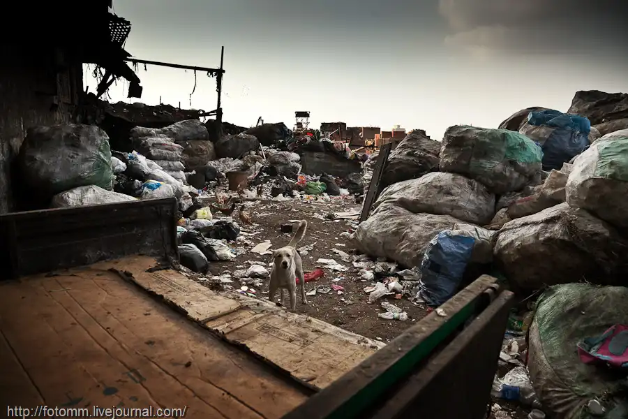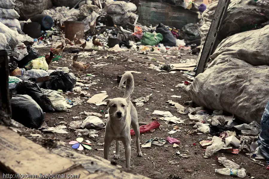 Тусклое закатное солнце еле пробивалось через маленькие оконца без стекол и дверные проемы без дверей. В потемках с трудом можно было разглядеть копошащиеся среди отходов человеческие фигуры. Одни при виде фотокамеры делали запрещающие жесты, другие продолжали деловито заниматься своим делом, не обращая на меня никакого внимания.
