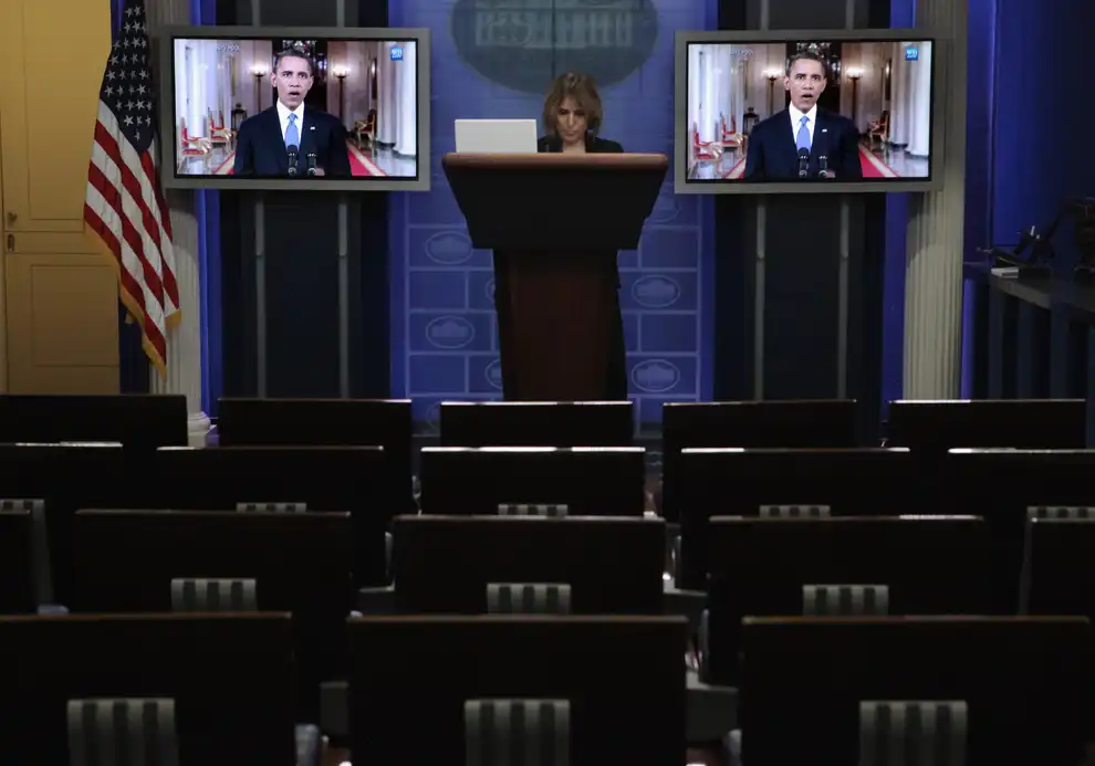 1. Президент США Барак Обама на экранах во время прямой трансляции в конференц-зале Белого дома 22 июня в Вашингтоне. Обама объявил о планах американского правительства по выводу 10 тысяч солдат в этом году и еще 20 тысяч в следующем. (Chip Somodevilla/Getty Images)