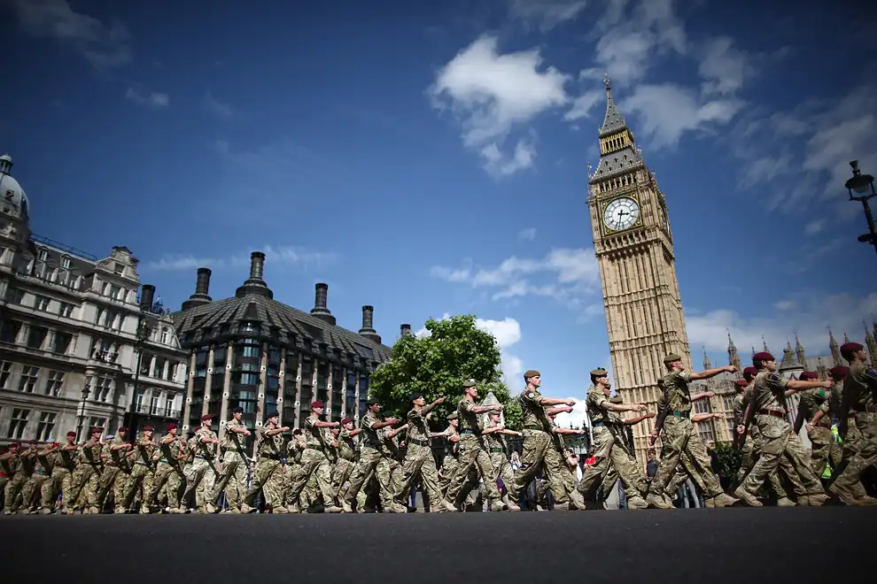 4. Солдаты 16-ой воздушно-штурмовой бригады во время парада в честь возвращения на родину в Лондоне. Вернувшиеся в апреле из Афганистана солдаты прошли маршем мимо здания парламента. (Peter Macdiarmid/Getty Images)