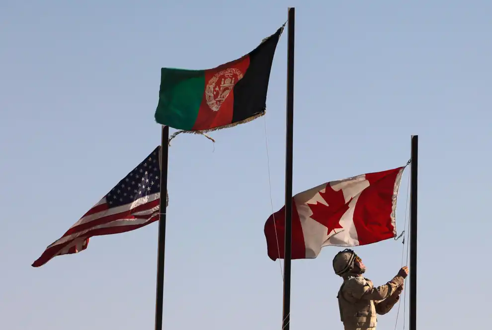 44. Канадский рядовой Дэнни Драпо опускает канадский флаг над базой Зангабад во время церемонии передачи базы в руки американских солдат. (Baz Ratner/Reuters)