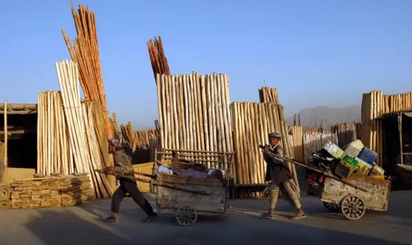 19. Афганцы с телегами на фоне придорожных деревянных лотков в Кабуле. (Gemunu Amarasinghe/Associated Press)