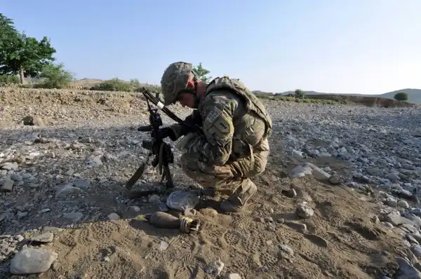 38. Солдат осматривает минометный снаряд, найденный на дне реки в поселке Сабари, который, скорее всего, был использован во время обстрела базы ночью ранее. (Ted Aljibe/AFP/Getty Images)