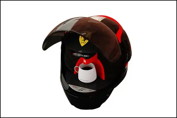 Дизайнер Ильгар Рустамов создал довольно необычную кофеварку, предназначенную для того, чтобы стоять на столах у фанатов Ferrari. Ведь она сделана в виде гоночного шлема с логотипом этого легендарного автоконцерна.